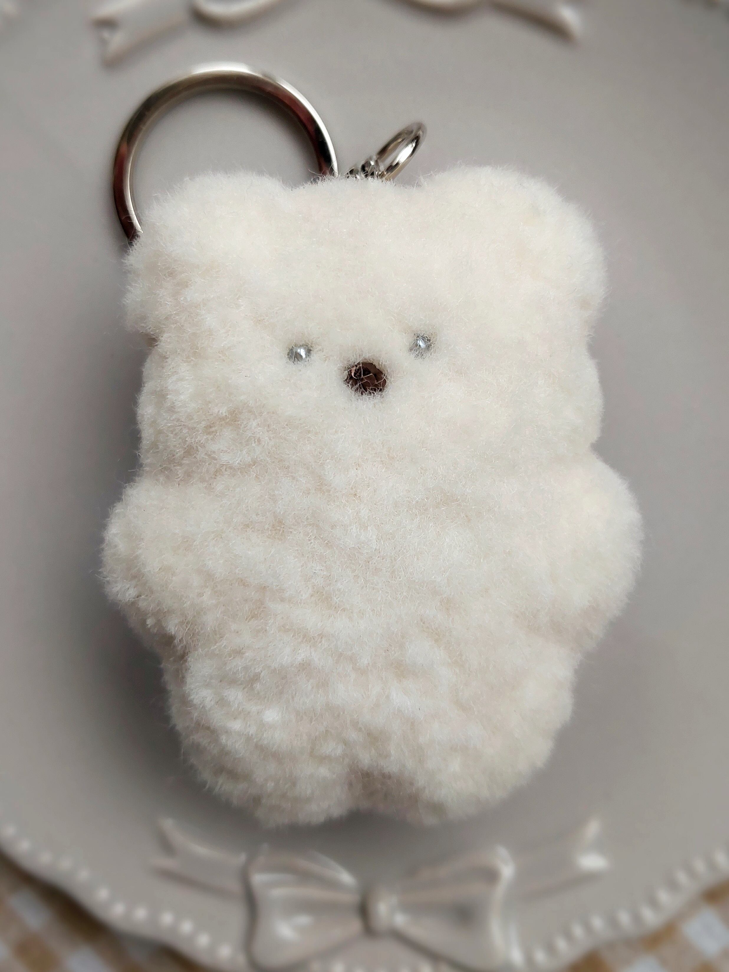 こちらは、パンチニードルでひとつひとつ刺繍して製作したくまのぬいぐるみキーホルダーです。